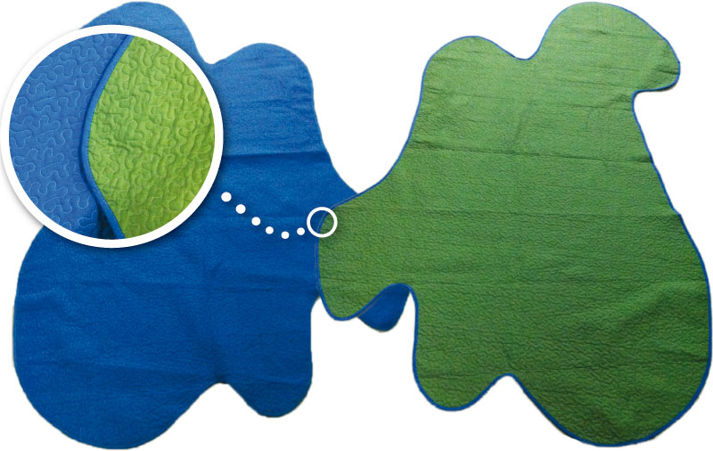 Med en grön och en blå sida (gräs och vatten) samt en fantasieggande form är mattan tänkt att kunna användas i skatten-samlingens olika delar.